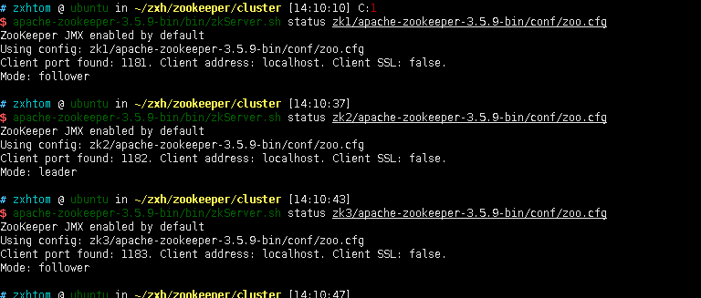 集群启动完成了。但是我们现在对zk集群好像还是没有太大的感知。比如说我们不知道谁是leader。 可以通过如下命令查看每台zk的角色