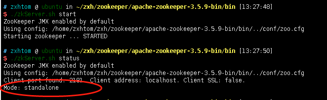 - 启动之后通过’zkServer.sh status’查看zookeeper运行状态。我们可以看到此时是单机模式启动的。