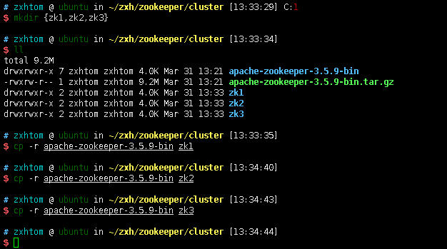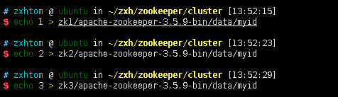 mkdir {zk1,zk2,zk3}, 首先创建zk1,zk2,zk3三个文件夹存放zk -