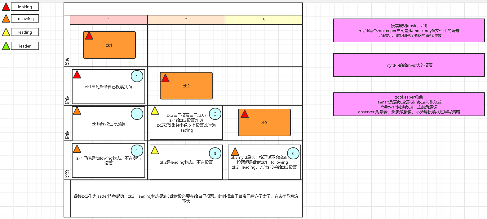 其实在启动阶段zk2获取到两张投票是有一个PK的逻辑在里面的。上述启动阶段的投票是个人的一个抽象化理解。