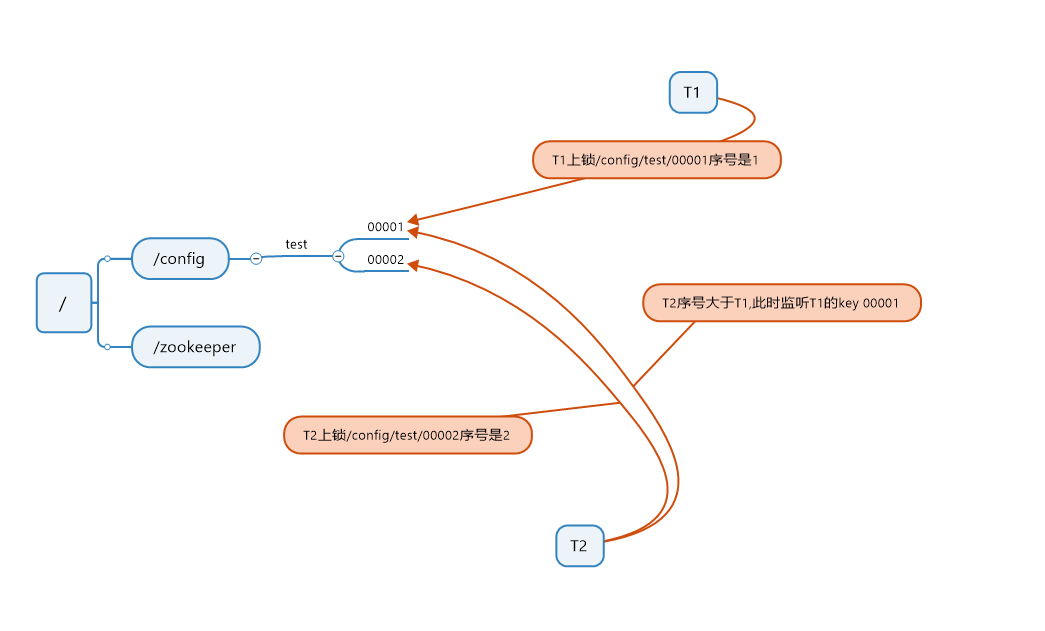 - 最终InterProcessMutex实现加锁。加锁会在指定的key上添加一个新的key且带有编号。此时线程中的编号和获取的/config/test下集合编号最小值相同的话则上锁成功。T2则上锁失败,此时会想前一个序号的key添加监听。即当00001失效时则00002对应的T2就会获取到锁。这样可以保证队列的有序进行。