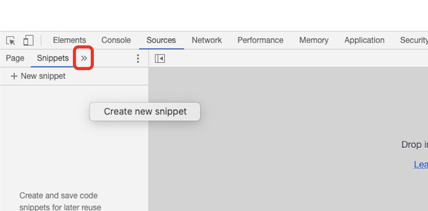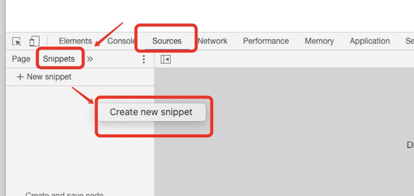 我们也可以在 Chrome 浏览器中创建一个脚本来执行,在开发者工具中点击 Sources 面板,选择 Snippets 选项卡,在导航器中右击鼠标,然后选择 Create new snippet 来新建一个脚本文件: