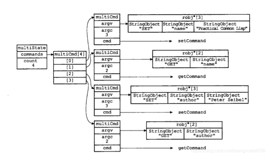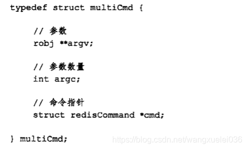 事务队列是一个multiCmd类型的数组,数组中的每隔multiCmd结构都保存了已入队命令的相关信息,包括指向命令实现函数指针、命令的参数,以及参数的数量