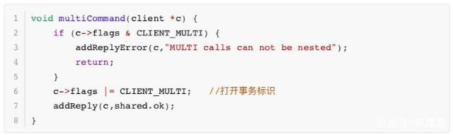Redis中使用MULTI命令标记事务的开始,可以理解为在传统关系型数据库中的BEGIN TRANCATION语句,Redis将执行该命令的客户端从非事务状态切换成事务状态,这一切换是通过在客户端状态的flags属性中打开REDIS_MULTI标识完成, 我们看下Redis中对应部分的源码实现: