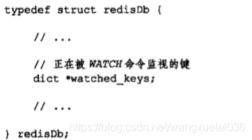 每个Redis数据库都保存着一个watched_key字典,用于记录被WATCH命令监视的数据库键,而字典的值是一个链表,链表中记录了所有监视相应数据库键的客户端