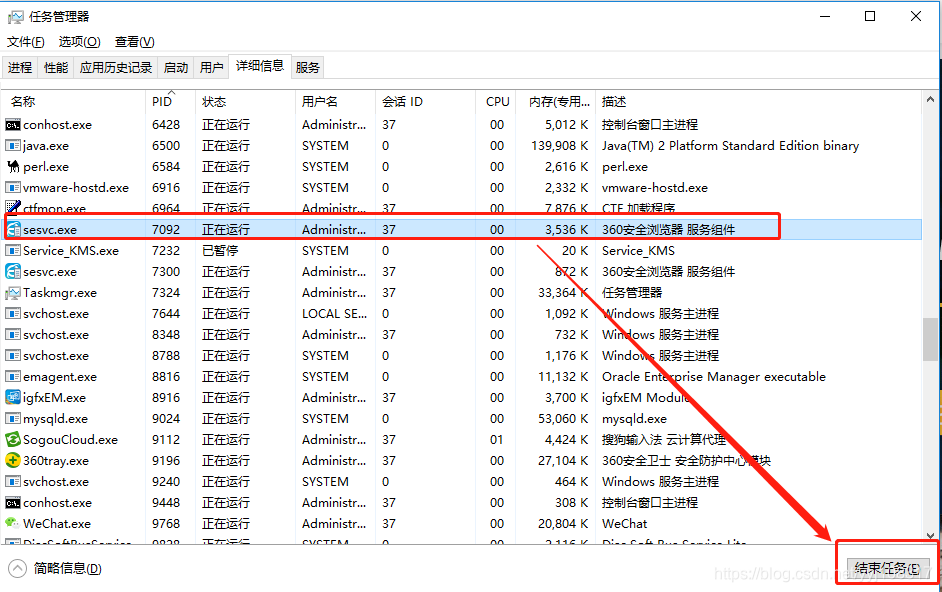 4、若想80端口不被占用,则需要在任务管理器中结束相应的进程,按快捷键“Ctrl+Alt+Delete”调出Windows任务管理器,找到“sesvc.exe”,结束任务即可!