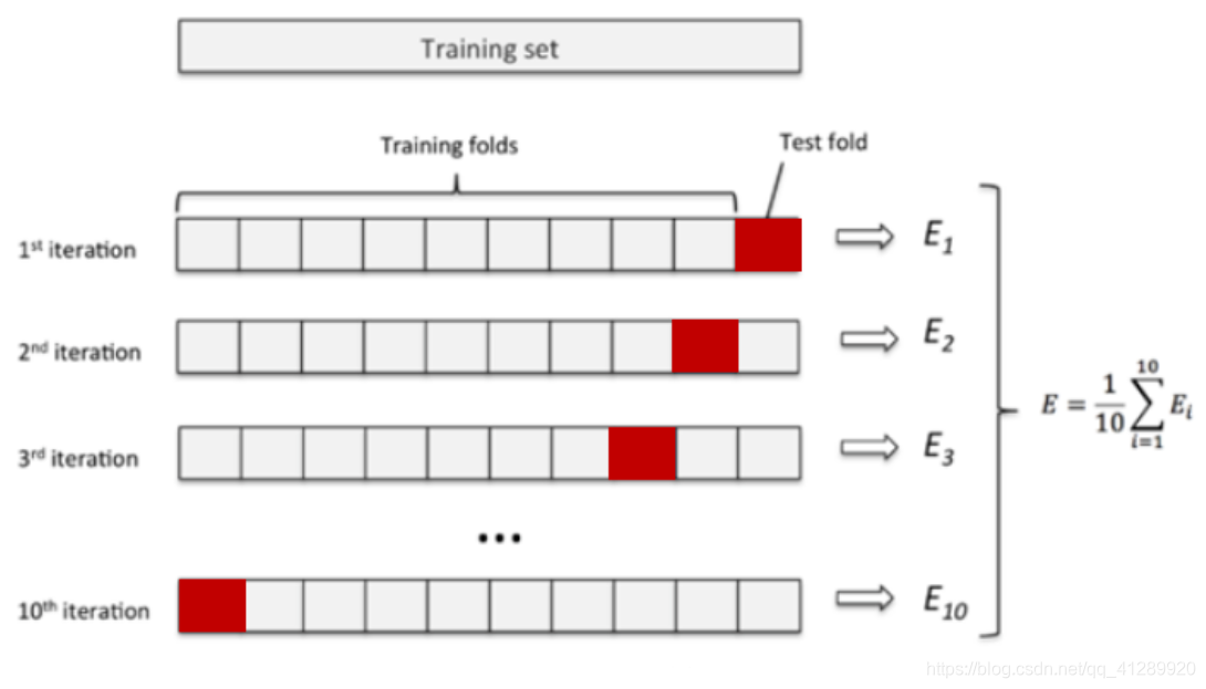 定义与原理:将原始数据D随机分成K份,每次选择(K-1)份作为训练集,剩余的1份(红色部分)作为测试集。交叉验证重复K次,取K次准确率的平均值作为最终模型的评价指标。过程如下图所示,它可以有效避免过拟合和欠拟合状态的发生,K值的选择根据实际情况调节。