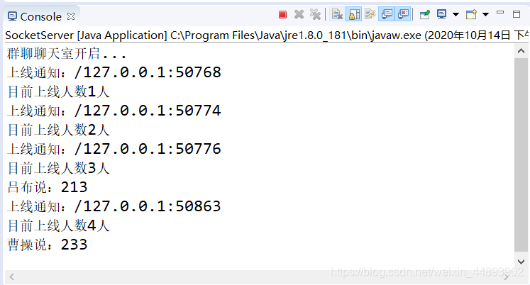 System.out.println("上线通知:"+socket.getInetAddress()+":"+socket.getPort());