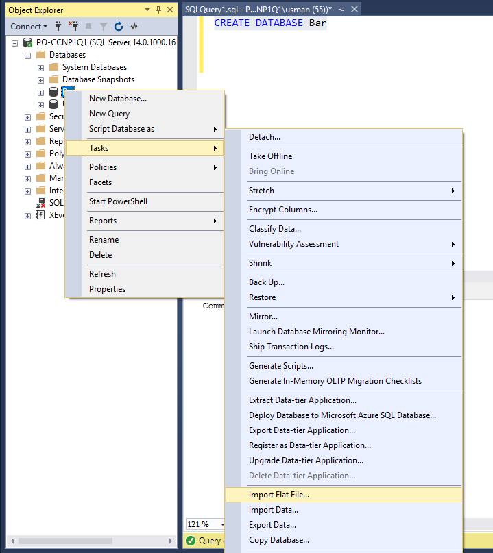 The first step is to go to the Object Explorer -> [Database] -> Tasks and click the “Import Flat File …” as shown in the following figure: