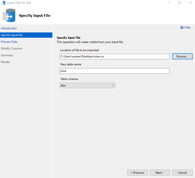 Since we imported the file into our “Bar” database in the “wine” table, the “Bar” database should contain a table named “wine”. Go to Object Explorer-> Databases -> Bar-> Tables, here you should see your data table “dbo.wine”, as shown below: