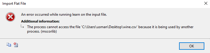 Simply close the CSV file and/or any other application that has access to the CSV file, go to the previous screen and click the “Next” button again to fix this.