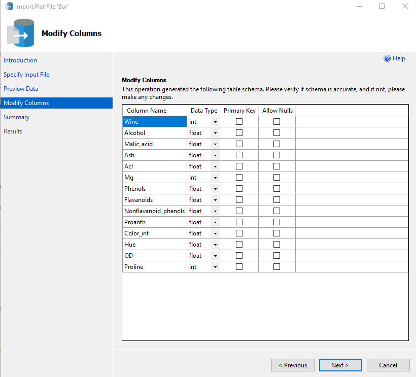 Furthermore, you can also set a column as the Primary key and allow Null values for any column. Once you are done with modifying the columns, click the “Next” button.