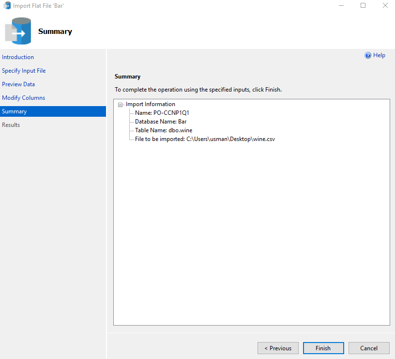 A new window displaying the summary of the operation including the name of the Server, Database, Table and the file that is being imported will be displayed. This is shown in the following screenshot: