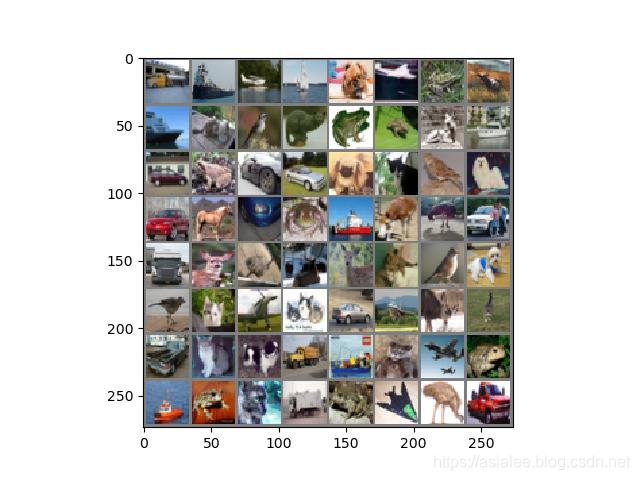 使用 torchvision.utils.make_grid 类方法将一个批次的图片构造成网格模式。需要传递给它的参数就是一个批次的装载数据,每个批次的装载数据都是4维的,维度的构成从前往后分别为batch_size、channel、height和weight,分别对应一个批次中的数据个数、每张图片的色彩通道数、每张图片的高度和宽度。在通过torchvision.utils.make_grid之后,图片的维度变成了(channel,height,weight),这个批次的图片全部被整合到了一起,所以在这个维度中对应的值也和之前不一样了,但是色彩通道数保持不变。