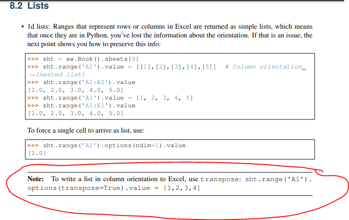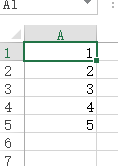 1 # -*- coding:utf-8 -*- 2 import xlwings as xw 3 4 list2 = [1,2,3,4,5] 5 sht = xw.Book().sheets('sheet1') # 新增一个表格 6 sht.range('A1').options(transpose=True).value = list2