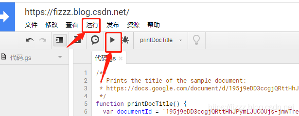 点击三角形运行printDocTitle函数, 我们这里的文件都是以 gs 为扩展名的。不要把它真正理解为js
