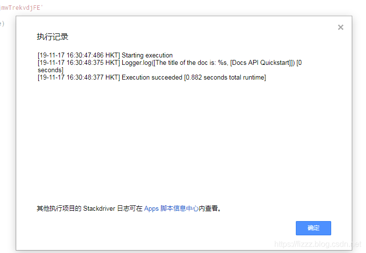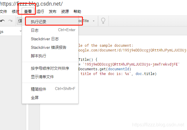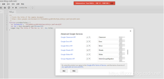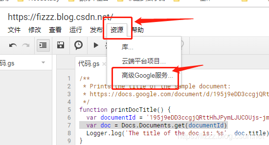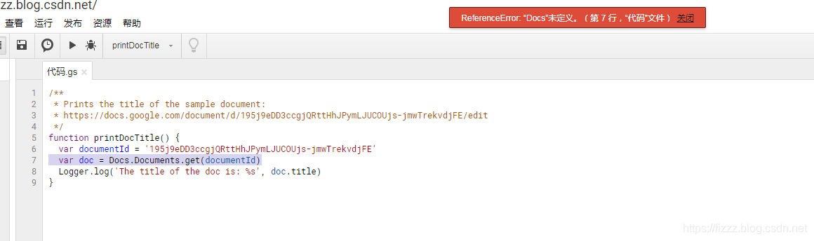 这段脚本就是获取一个google doc文件,并打印出文档的title。 而Docs这个对象,其实我脚本环境内置的一个类。要使用这个类还需要用户授权。