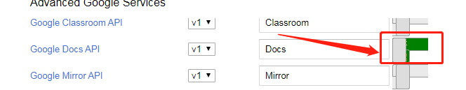 我们找到Google Docs API 这一行,然后点击最后一列的,将其变为绿色