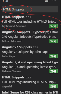 二、点击完成之后,旁边会有一个搜索框,搜索HTML Snippets,然后点击安装