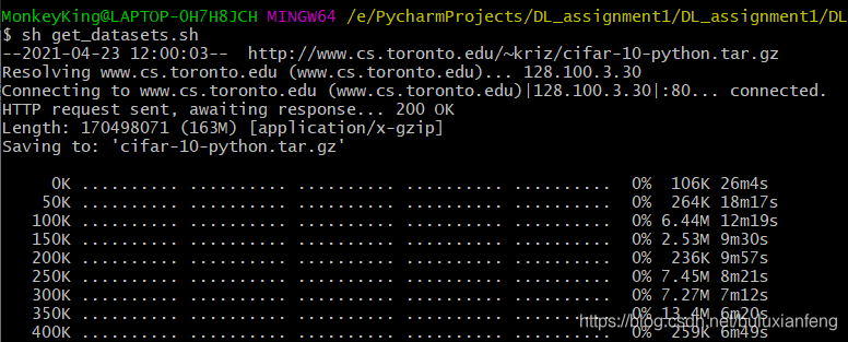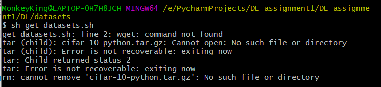 问题描述:小白以前用github或者下载资源时都是直接下载,而不用git下载第一次用Git下载资源时运行.sh文件中有wget的命令,会出现以下错误:$ sh get_datasets.shget_datasets.sh: line 2: wget: command not foundtar (child): cifar-10-python.tar.gz: Cannot open: No such