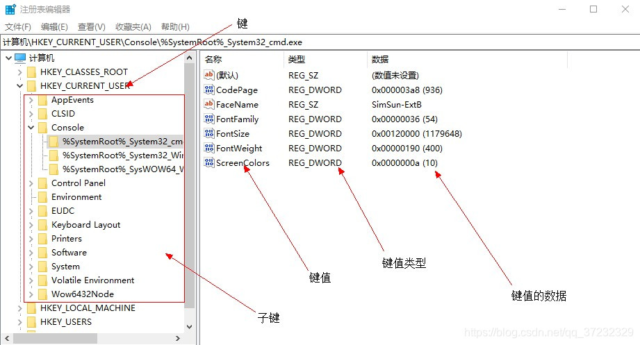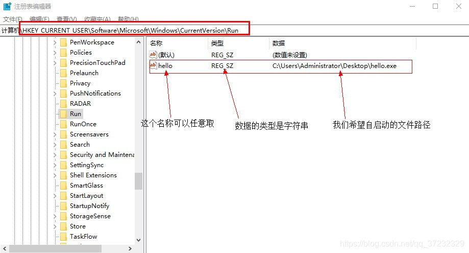 可以看到上面两项唯一的区别就是根键(简称键)不同,子键是一样的。HKEY_CURRENT_USER与HKEY_LOCAL_MACHINE的区别是影响范围。前者影响只当前用户而后者是系统配置影响所有用户。只要里面添加入新的键值对就可以实现自启动。我们具体来看下: