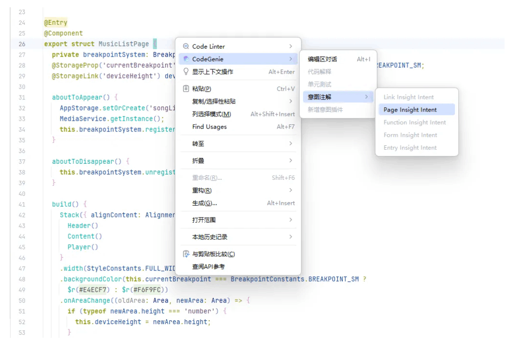 1. 在DevEco Studio的编辑器中,在光标处或选中代码片段后“右键” => “CodeGenie” => “Insight Intent”=> 点击5种意图生成的子菜单;