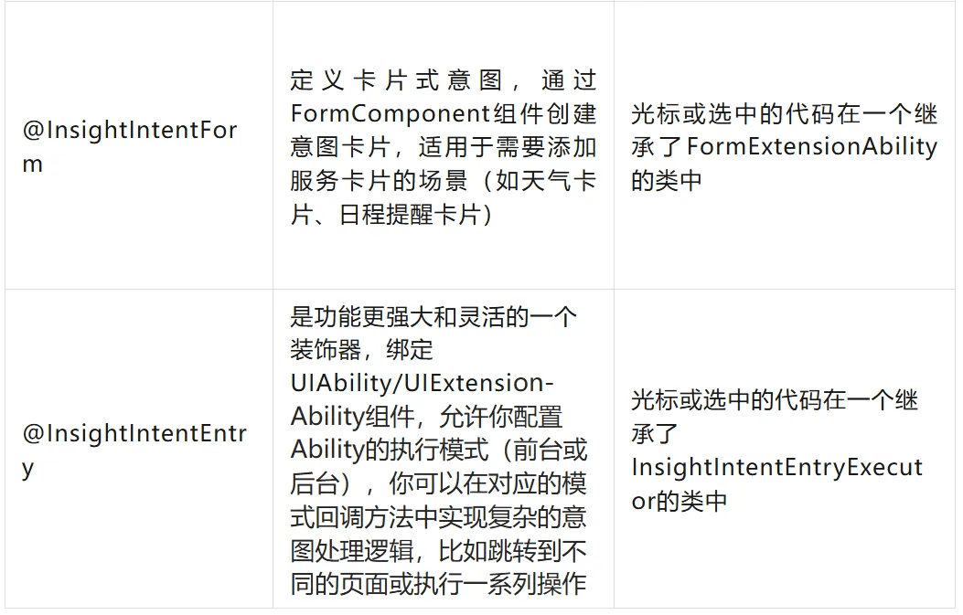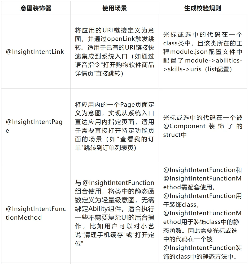 目前API 20开始已经支持应用开发者通过装饰器开发意图,支持5类意图装饰器的生成:link/page/function/form/entry接入意图装饰器。