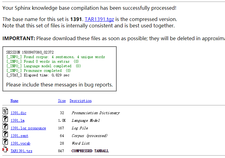 这里生成了好几个文件,我们可以把整个 .tgz 文件下载下来解压缩,其中得到的 .lm 文件就是我们需要的语言模型。