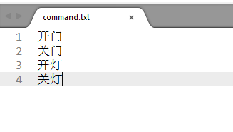 首先我们需要把想要识别的命令词编写成命令集,打开 Sublime Text 新建 txt 文件,编码采用 utf-8,每一行写一个命令词,如图所示: