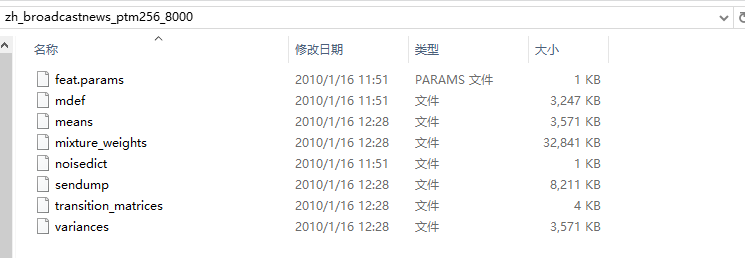 同样是在资源网盘的 Mandarin 文件夹下,下载 .tar.bz2 的压缩文件解压后,得到如下声学模型文件:
