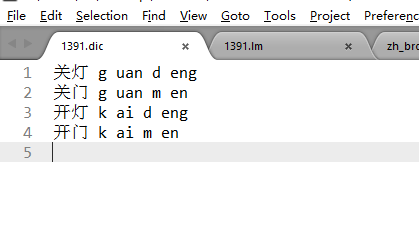 字典模型的作用,就是告诉语音识别器中文的发音,这样他才能认得中文,字典模型很简单,首先到 PocketSpinnx 的资源网盘,进入 Mandarin 文件夹,下载一个后缀为 .dic 的文件,里面涵盖了很多普通话的发音,查找到我们的命令词,找不到完整命令词的也可以找单个字的发音,然后参考这个 .dic 文件的格式,在上一步获取到的 .lm 语言模型文件中还有一个 .dic 文件,补充完整这个 .dic 文件的发音,如图所示: