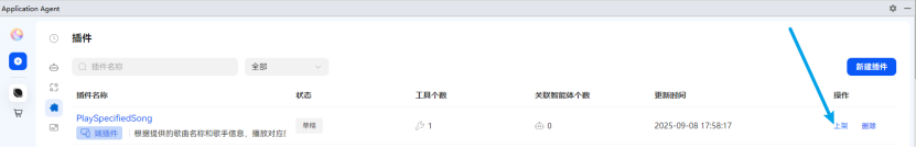意图插件注册完成后,默认处于草稿状态。此时它还无法被智能体识别和绑定。你需要先完成插件的上架操作,否则在后续创建智能体时将无法选择该插件进行绑定。