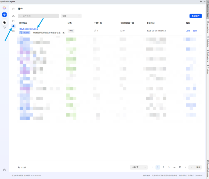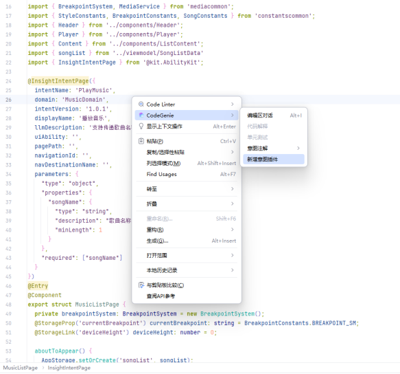 最后一步,将生成的意图注解插入到MusicListPage类的头部后,在装饰器的代码块内点击“右键” => “Code Genie” => “Add Intent Plugin”,即可在IDE的内嵌的小艺智能体平台中完成意图插件注册,并在该平台上进行智能体的创建。