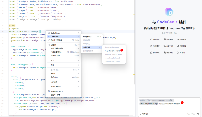 以下图中的一个生成播放指定音乐的意图装饰器为例,点击意图的页面意图子菜单,可在CodeGenie的对话窗口中输入提示词(可选),告诉小艺你想要生成的意图注解: