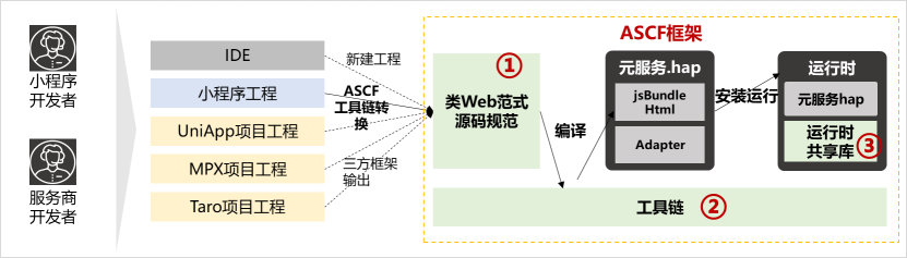 ASCF框架提供了系统级的运行时能力,开发阶段编译调试的工具链。同时提供了转换工具将已有的小程序项目快速转换为ASCF框架的元服务项目。