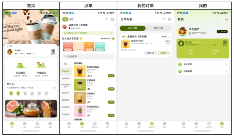 2.餐饮茶饮元服务模板:本模板为餐饮茶饮类元服务提供了常用功能的开发样例,模板主要分首页、点单、我的订单和我的四大模块。本模板已集成华为账号、地图、华为支付、通话等服务,只需做少量配置和定制即可快速实现关联华为账号、商家位置定位导航、购买茶饮和联系商家等功能。