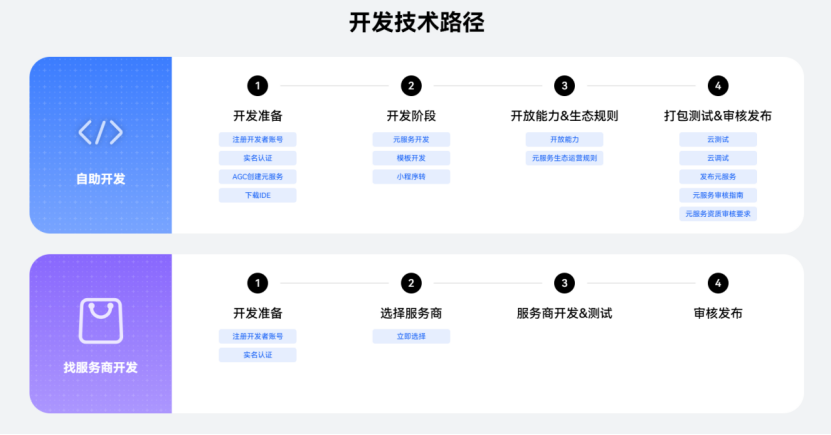 - 自助开发:流程清晰易懂,注册开发者账号并完成实名认证后,通过AGC创建元服务、下载IDE即可启动,开发阶段支持元服务原生开发、模板复用或小程序快速转换;
