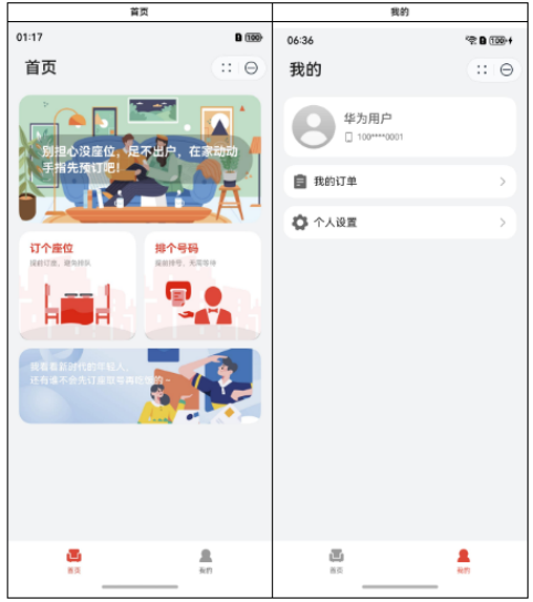 3. :本模板为餐厅排队元服务提供了常用功能的开发样例,模板主要分首页和我的两大模块: 首页:主要提供订座和排号的入口。 我的:展示个人信息,提供查看全部订单的入口。
