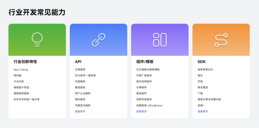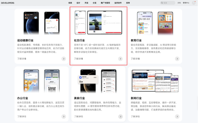 HarmonyOS开发者官网推出的社交交友行业解决方案,以 “能力集成 + 工具支撑 + 生态服务” 为核心,为社交应用从搭建到优化提供全链路支持,助力开发者快速破局、实现业务增长。组件与 SDK 资源丰富,社交相亲元服务模板、消息列表组件、开屏广告组件等开箱即用,整合融云IM、极光推送、华为位置服务等关键 SDK资源,缩短开发周期。此外,方案配套完善的支持体系:行业开发精品课提供从架构到功能的实