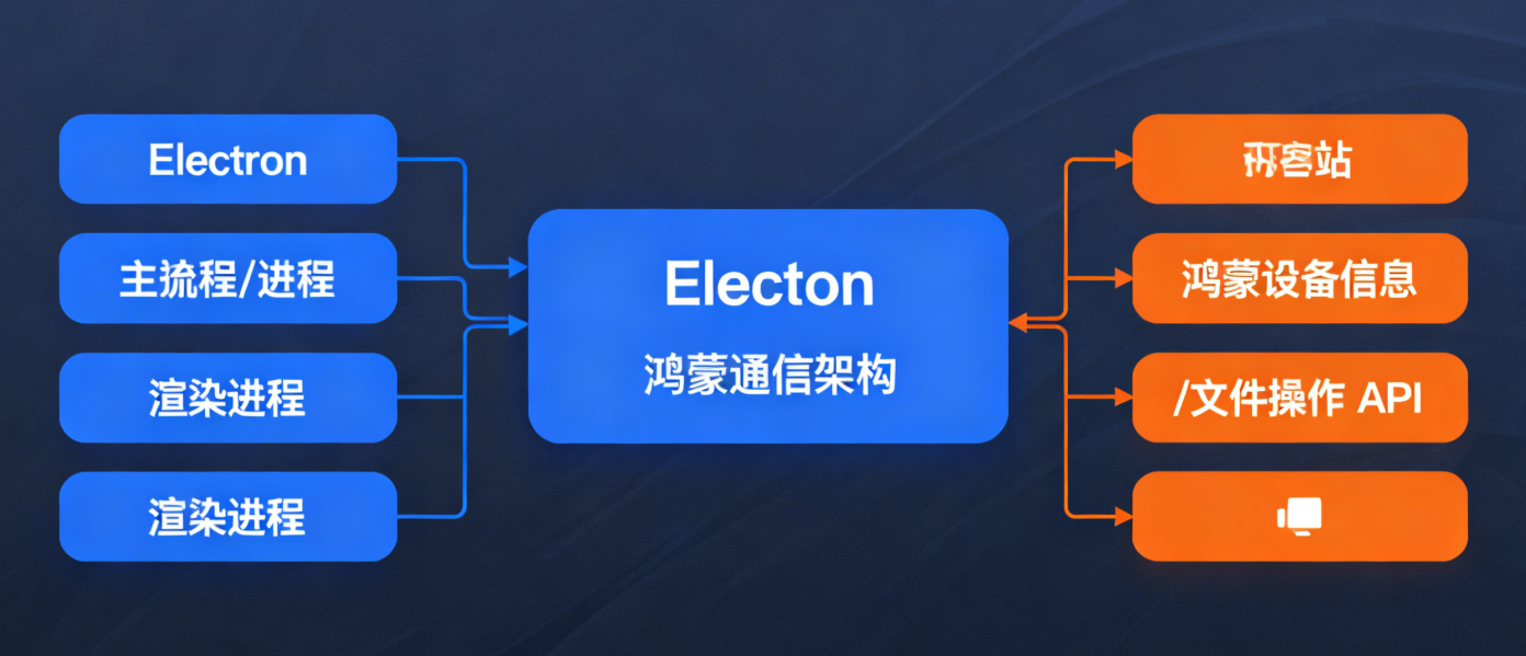 - Electron 的 Node.js 层与鸿蒙的系统 API 桥接,实现文件操作、设备调用等原生能力;