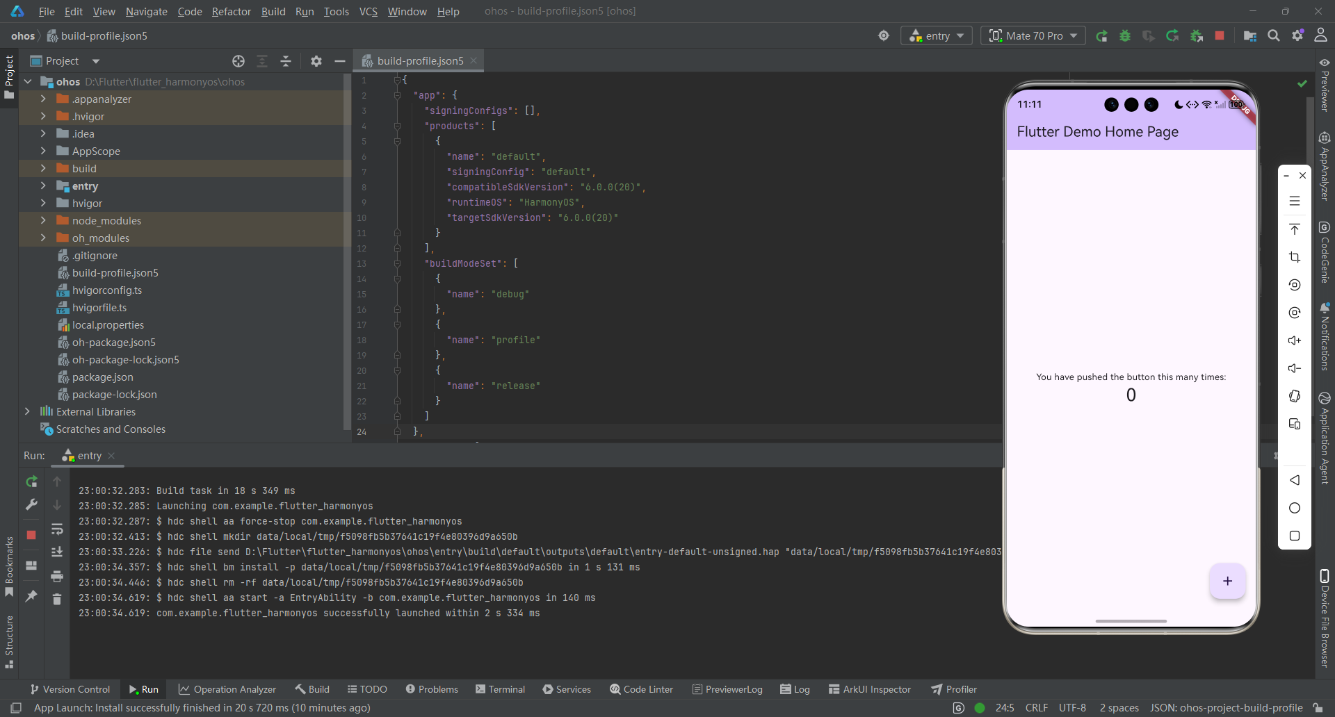 运行项目:确保 HarmonyOS 模拟器已启动,或已连接 HarmonyOS 真机(需开启开发者模式和 USB 调试);在 DevEco Studio 工具栏中选择对应的运行设备;点击工具栏中的“Run”按钮(绿色三角形),等待项目编译和运行;若模拟器/真机中出现 Flutter 默认的计数器应用界面(显示“0”和“+”“-”按钮),则说明环境搭建成功,可正常进行 Flutter 开发。