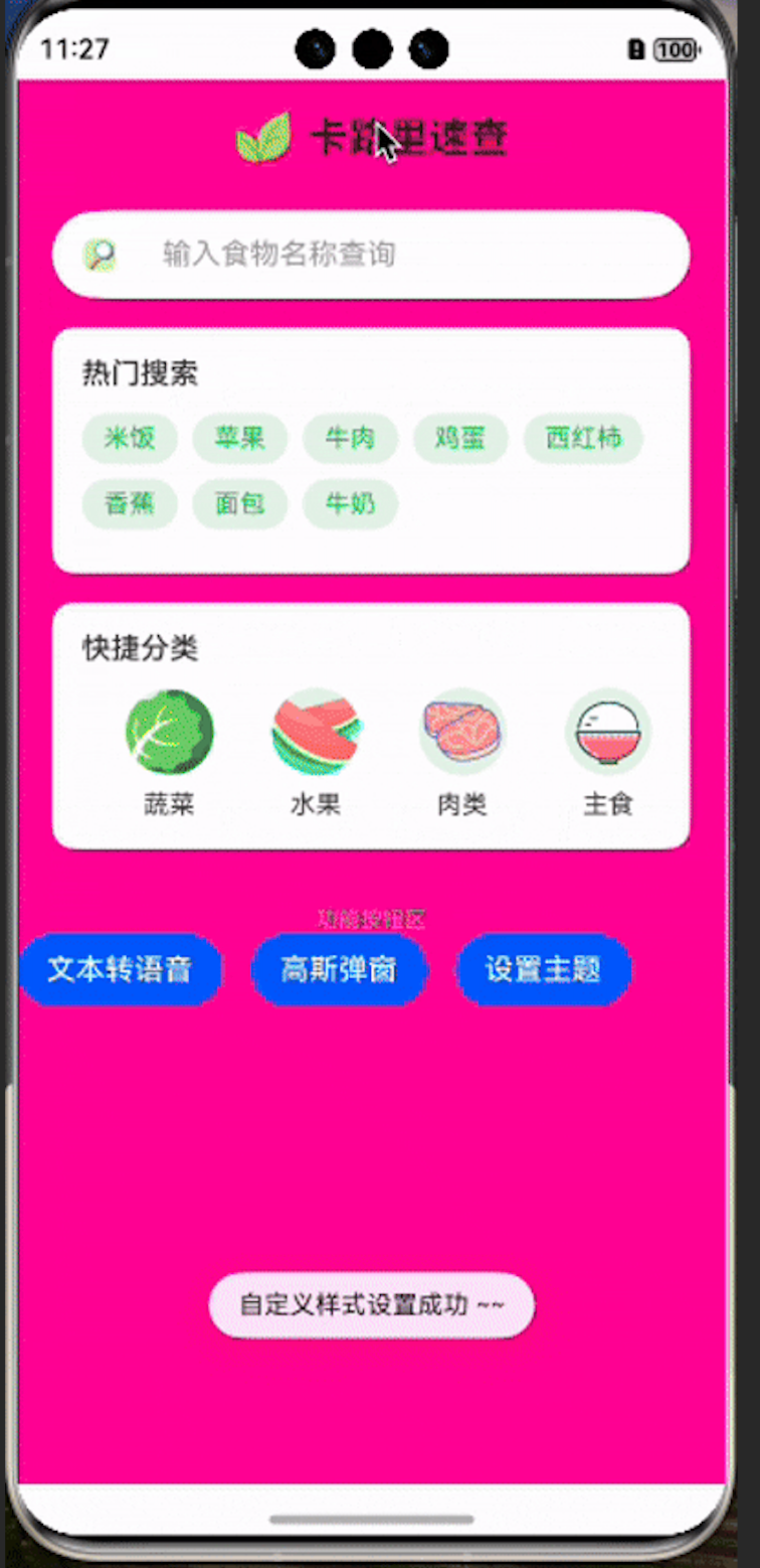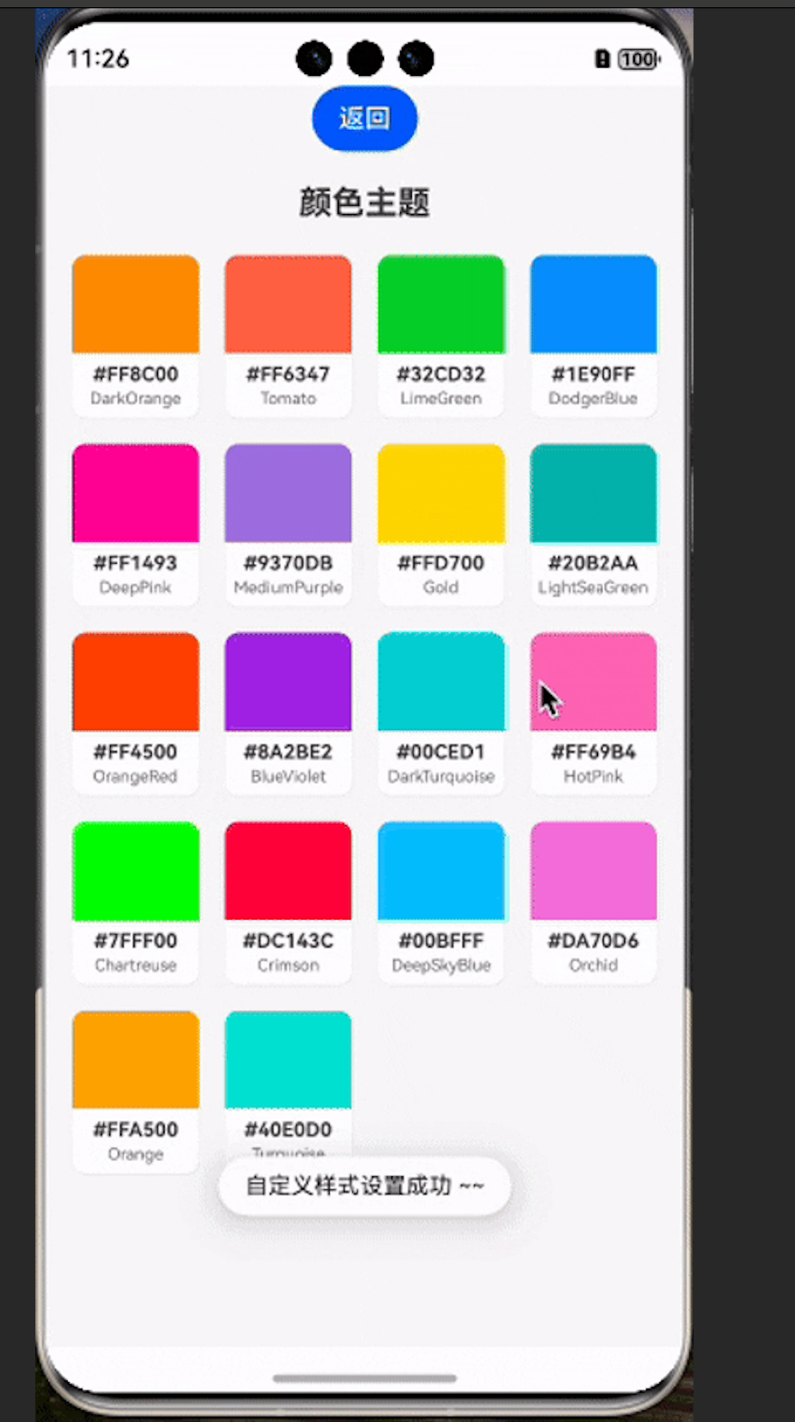 如下图所示,用户可以从首页进入设置页面选择喜欢的主题色,设置完成后即使关闭应用重新打开,个性化设置依然保持不变,真正实现了数据的持久化存储。