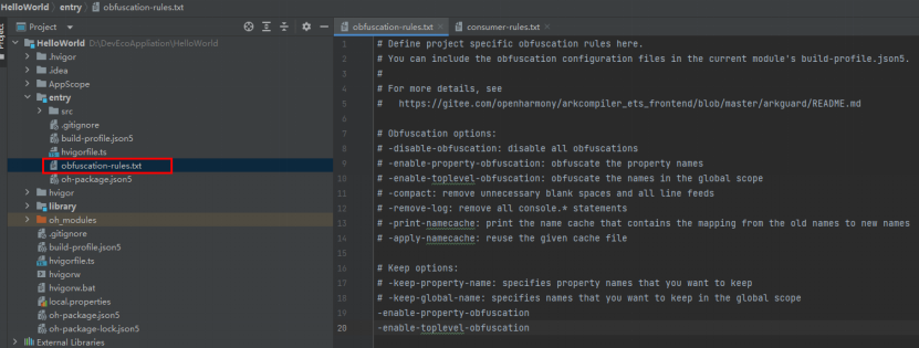 新建工程时,每个模块下都有 obfuscation-rules.txt 文件,用于配置混淆。