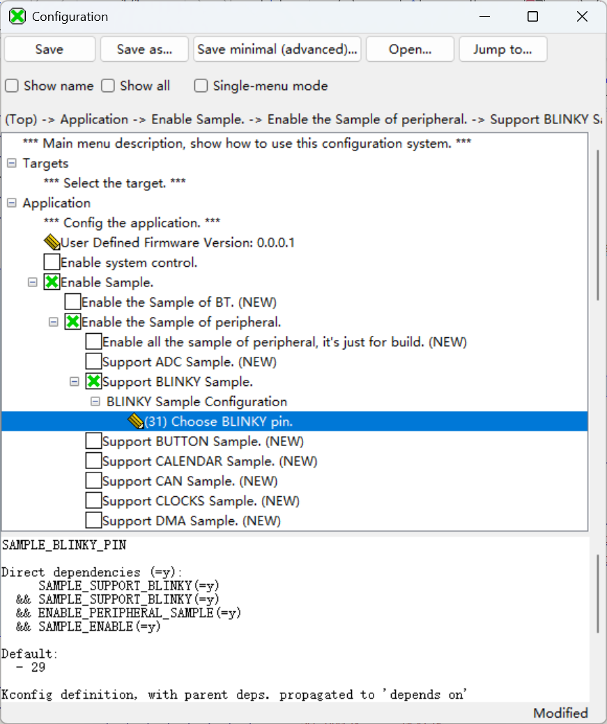 我们简单编译一个LED灯例程,依次使能路径 Application->Enable Sample->Support the Sample of peripheral->Support BLINKY Sample;“Choose BLINKY pin”选项配置LED管脚号,Hi2821开发板的LED灯在31脚。