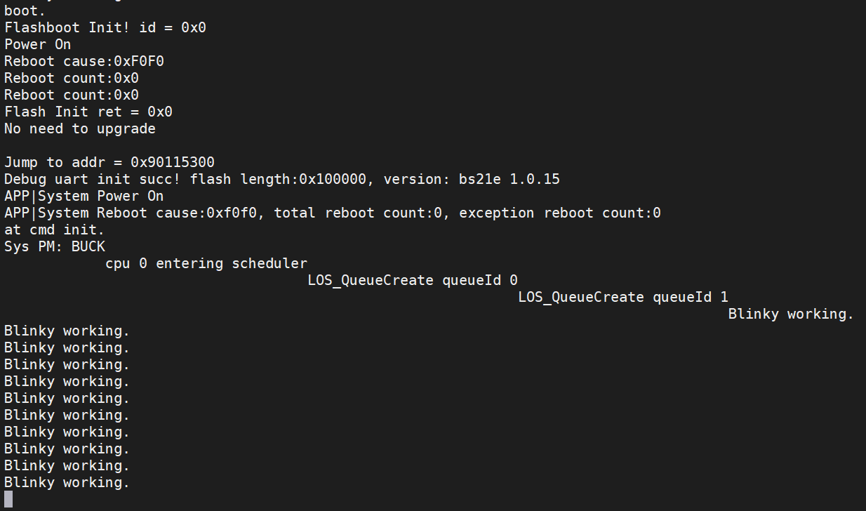 看到上面的log就表示成功烧录固件了,这时就能看到开发板的LED灯在闪了。打开串口助手,可以看到对应的系统log。