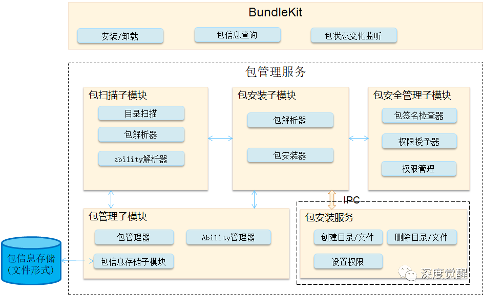 「包安全管理子模块」:签名检查、权限授予、权限管理。