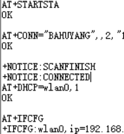 - 通过DHCP向AP请求wlan0的IP地址:AT+DHCP=wlan0,1