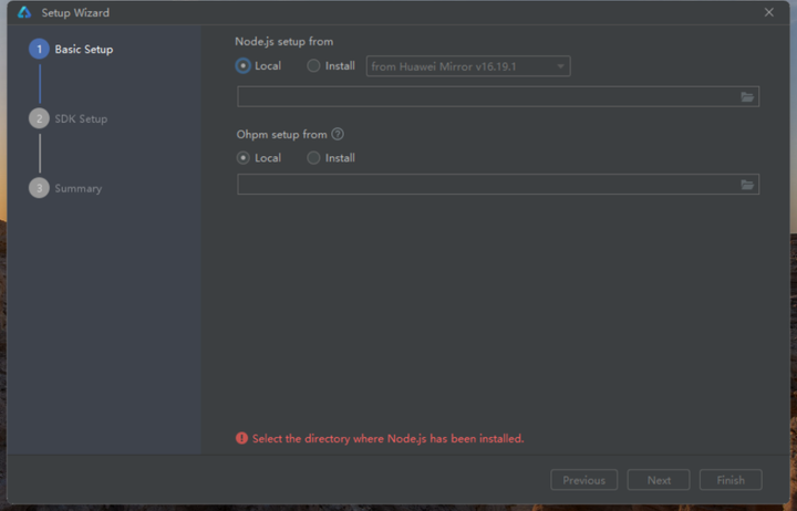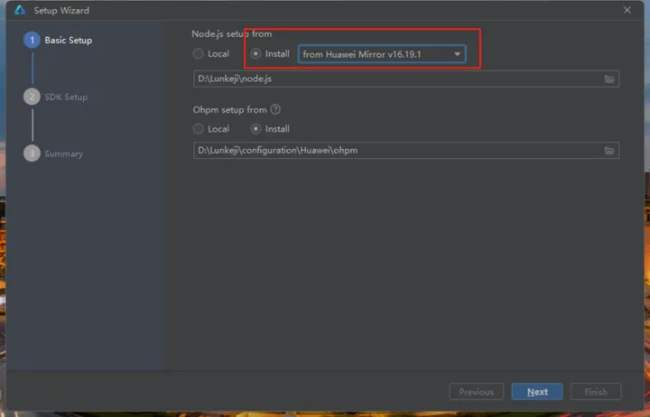 分别配置两个依赖的环境,一个是Node.js,选择华为的镜像就可以了;另一个是Ohpm。两个依赖环境将安装在指定的目录中。