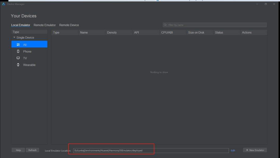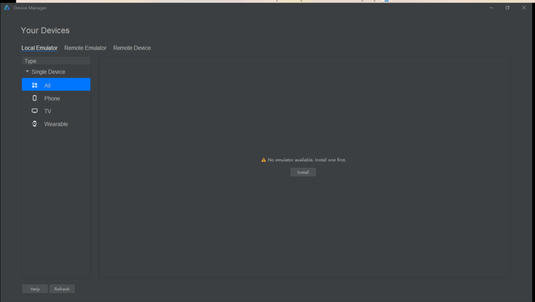 设备模拟器需要下载安装的,选择Local Emulator,IDE提示本地没有找到模拟器,我们点击 Install安装一个。