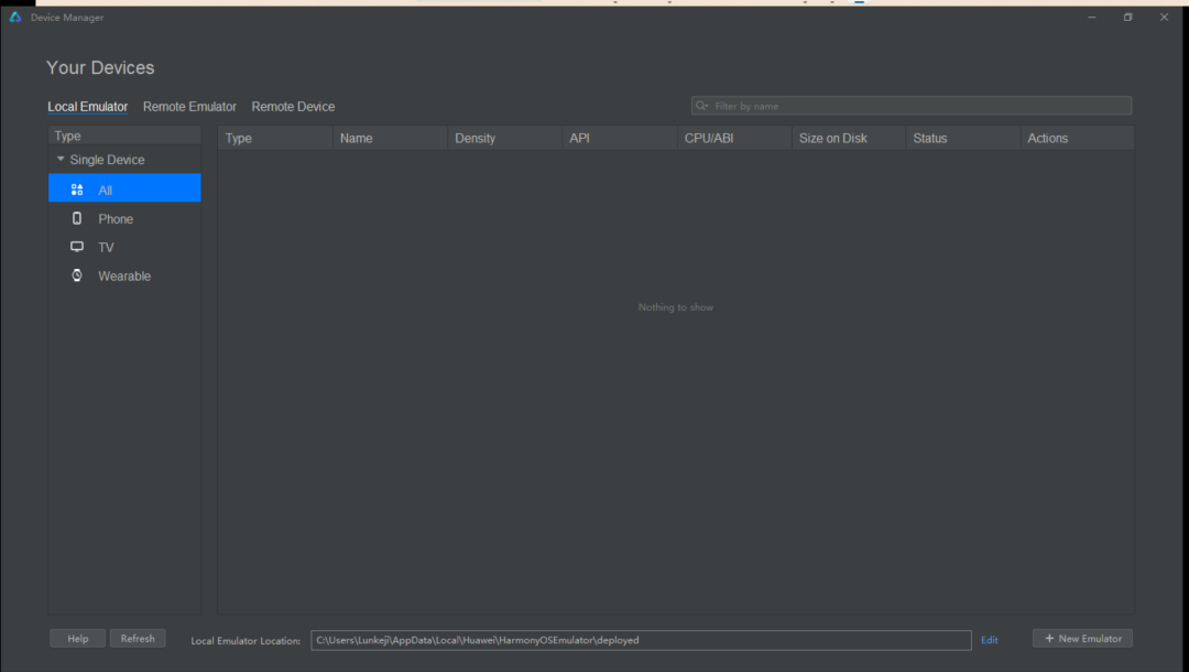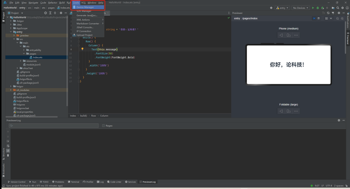 到这一步你所看到的预览区显示的只是UI的预览,我们需要把这个APP在手机上运行起来。你可以自己买一台华为“遥遥领先”的设备进行安装运行,当然你也可以在电脑上模拟一台设备,在模拟的设备上运行。IDE有两个地方可以添加设备,一个是顶部的Tools工具栏Device Manager添加设备,另一个是IDE右上角有个添加设备的按钮。